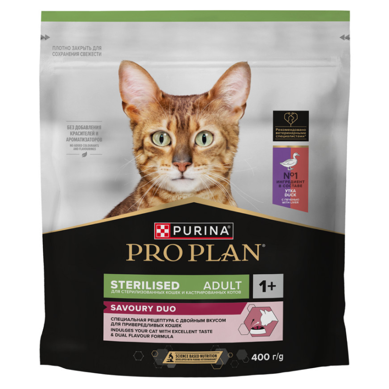 Команда квалифицированных ветеринарных специалистов и диетологов разработала сухой корм для стерилизованных привередливых кошек PRO PLAN® Sterilised SAVOURY DUO с двойным вкусом. Это сбалансированный корм, в котором есть весь комплекс питательных веществ и микроэлементов, важных для здоровья вашего питомца.
