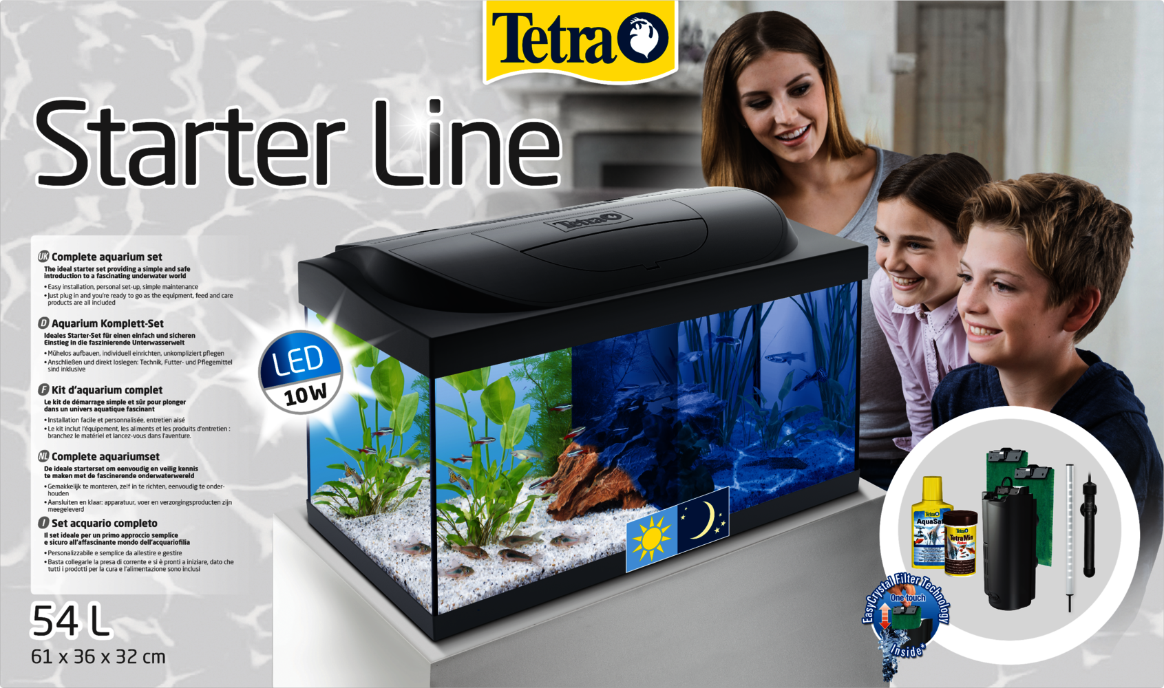Аквариумы Тетра Стартер Лайн прекрасно подойдут для всех новичков в мире аквариумистики. Они представлены в 4 размерах (30, 54, 80 и 105 л), имеют ряд полезных функций и оснащены всем необходимым техническим оборудованием. Самый маленький аквариум прекрасно подходит для содержания ракообразных и растений, в то время как аквариум средней величины станет идеальным домом для гуппи, меченосцев и прочих рыбок. Стеклянные аквариумы особенно прочны, их стенки сделаны из специального флоат-стекла толщиной четыре мм, которое позволяет наблюдать за жизнью водных питомцев без помех. Крышка аквариума очень надежна и не даст ракообразным выбраться из аквариума. Удобный лючок для подачи корма позволяет легко кормить рыб, не открывая для этого полностью крышку. Встроенная в крышку светодиодная подсветка (с переключателем режима день/ночь) мощностью 10 Вт обеспечивает яркое и естественное освещение аквариума и характеризуется при этом отличными показателями энергоэффективности и долговечности. Фильтр Тетра ИзиКристал, который также включен в комплект поставки, поддерживает воду чистой и прозрачной, эффективно удаляя загрязнения и водоросли. Фильтрация осуществляется следующим образом: при биологической фильтрации полезные бактерии заселяют биошарики и губку фильтра. При механической фильтрации фильтрующий наполнитель удаляет из воды даже мельчайшие частицы грязи. Наличие сменных картриджей означает, что вам не придется тратить много времени на очистку корпуса фильтра. Установка картриджей очень проста — вам даже не нужно мочить руки! Для оптимального качества воды менять картриджи необходимо каждые четыре недели. В комплект входит один запасной картридж. В 54-, 80- и 105-литровых аквариумах также есть нагреватель, который поддерживает температуру воды на уровне 25 °C. Дополнительную информацию о запуске рыбок можно найти на упаковке соответствующего аквариума. Простой в установке и оснащенный впечатляющим техническим оборудованием, аквариум Тетра Стартер Лайн — это идеальный выбор для любого новичка в мире аквариумистики.