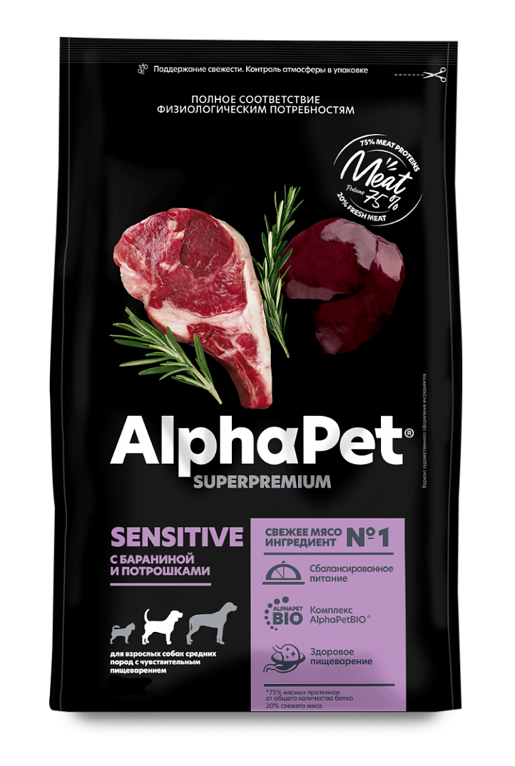 AlphaPet Superpremium / Сухой полнорационный корм с бараниной и потрошками для взрослых собак средних пород с чувствительным пищеварением