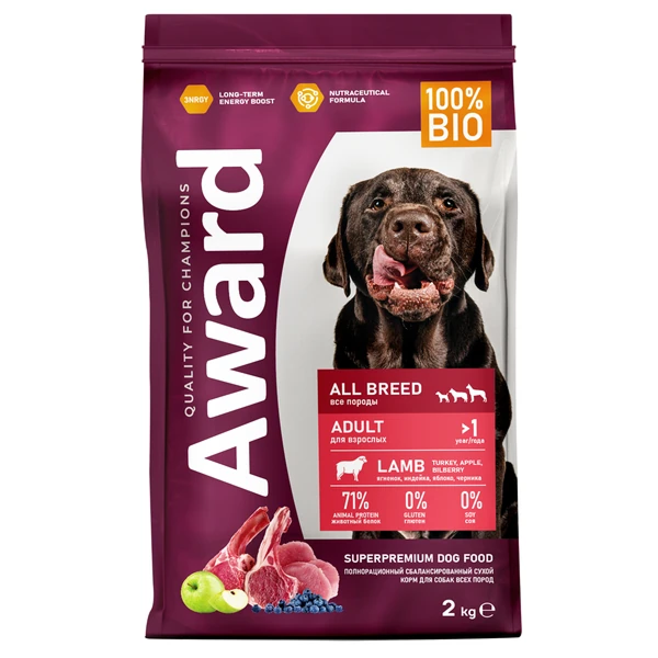 Сухой корм AWARD для взрослых собак всех пород с ягненком с индейкой с добавлением яблока и черники 2 кг.