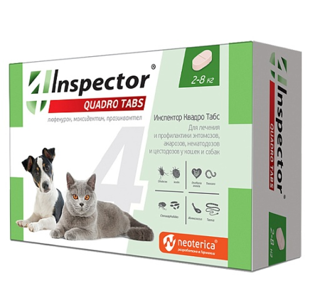 Таблетки Инспектор Квадро Табс для Кошек и Собак 2-8кг от внешних и внутренних паразитов (4шт)
