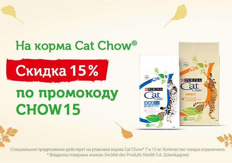 Акция на большие пачки корма Cat Chow по промокоду (скидка действительна только при указании промокода, указанного на рекламном баннере. Для оформления товара по акционной стоимости пропишите промокод в комментарии к заказу, либо назовите его оператору)