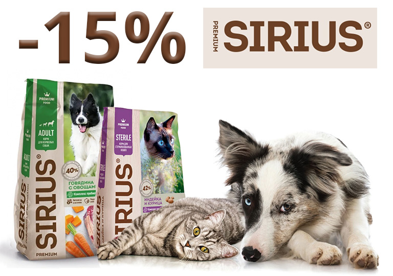 Акция на большие упаковки сухие корма для кошек и собак SIRIUS
