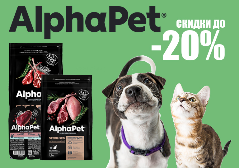 Акция на сухие и влажные корма для кошек и собак Alphapet