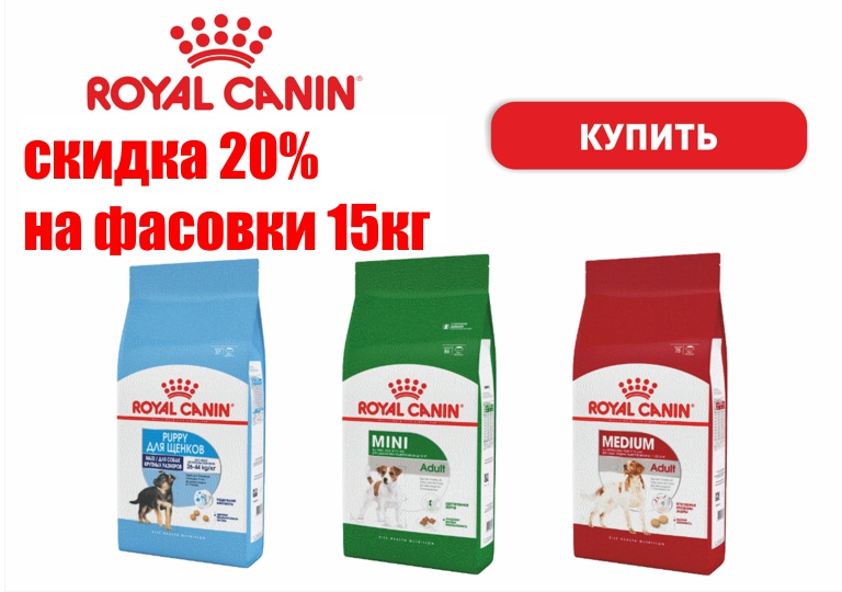 Акция на сухой корм для собак Royal Canin в фасовке 15кг.