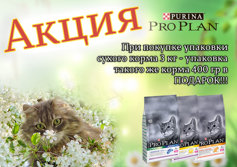 Акция на сухой корм для кошек Pro Plan 3 кг. + 400гр. в подарок